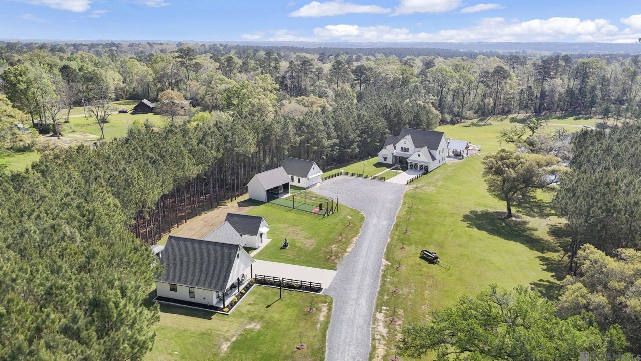 Spectacular estates like this are rarely available in sought-after St. Francisville. Meticulously maintained & thoughtfully designed, this exceptional property spans 17.21 acres across 3 tracts, with rolling hills, mature woods, beautifully stocked pond, and endless opportunities for recreation & relaxation. The estate includes a stunning main house, guest house, workshops, multiple outdoor living spaces, and acreage to explore. The main house, (6 yrs old) features 5 bedrooms, 3.5 baths, with dramatic windows across the rear showcasing breathtaking views of the pond & outdoor living areas, creating a seamless connection between indoor/outdoor spaces. The kitchen is a showstopper with a Thermador gas range, Sub-Zero refrigerator/freezer, huge island, and abundant custom cabinetry, perfect for both everyday living & entertaining. The primary suite is tucked away for privacy and features a luxurious ensuite bath with double vanities, soaking tub, custom shower, 2 large walk-in closets, plus thoughtful touches like motion-activated lighting under the lavatory cabinetry. Four additional bedrooms are all nice & spacious. Step outside and experience a private retreat with covered pavilions, outdoor kitchen, fire pit, hot tub, playground, manicured grounds, and a stocked pond with lighted fountain creating a private oasis. The guest house, also 6 years old (1,050 sf) with 1 BR, 1 bath is finished to the same high standards with abundant natural light, ideal for guests or extended family. Plus there's 1,200 square feet of workshop/storage spaces, finished with cabinetry and backsplash, providing plenty of room for equipment & hobbies. This unique estate is comprised of 3 tracts -- 8.36 acres with the main home, 2.23 acres with the guest house, and 6.62 acres of undeveloped land, offering incredible flexibility for expansion if desired. Homes like this are truly rare, so schedule your private tour and experience this one-of-a-kind property for yourself.