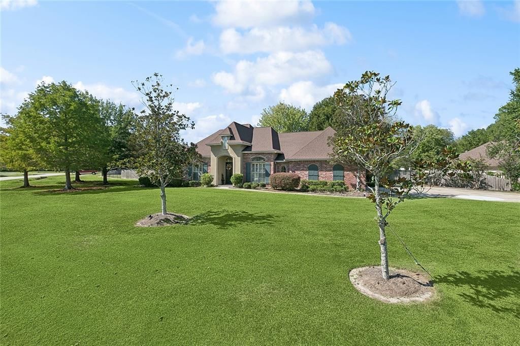 Beautiful French Country Home on an Oversized Lot! This well-kept French Country home sits on an expansive 0.64-acre lot in desirable Dominion Subdivision. The floor plan is ideal, offering spacious open areas for gathering and comfortable private retreats for relaxation. The kitchen impresses with abundant cabinetry, stainless steel appliances, extensive counter space, and under-cabinet lighting for bright, functional work areas. A sunroom with central air and TV wiring provides a cheerful space to unwind. The laundry room includes additional cabinets and a large storage locker for convenience. The oversized garage features a dedicated workshop room complete with cabinets, a utility sink, and its own air conditioning. Both the garage and workshop floors have a durable epoxy-style finish. Recent updates include new paint, updated flooring, a roof under 7 years old and two water heaters under 5 years old. Don't miss the primary suite under-lit tray ceiling, whirlpool tub, updated glass-enclosed shower, and two walk-in closets. You will love the eight foot entrance doors and plantation shutters! Multiple air returns help maintain even cooling throughout the home. Outside, double aluminum gates provide backyard access, while a quaint gazebo and remote-powered sunshade create inviting outdoor living spaces. Located in the favorable 'X" flood zone. Dominion residents enjoy sidewalks, a community pool, playground, and scenic ponds, a wonderful neighborhood for walking, relaxing, and connecting with neighbors.